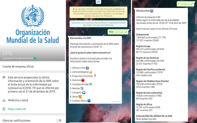 La OMS a través de la aplicación de mensajería WhatsApp, creo un nuevo canal de información en línea, en el que brinda información actual y oficial sobre la situación del coronavirus a nivel mundial.