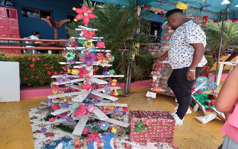 "Queremos promover la conciencia de hacer uso del reciclaje como una manera de cuidar la Madre Tierra. Hay muchos objetos que echamos a la basura y que bien podemos reutilizar en esta temporada navideña, en el caso de nosotros hicimos un árbol y recreamos una hogar Navideño hecho de cajillas de gaseosas y también utilizamos cartón y creo que lo hicimos bien", dijo Ríos mientras terminaba de arreglar su stand.