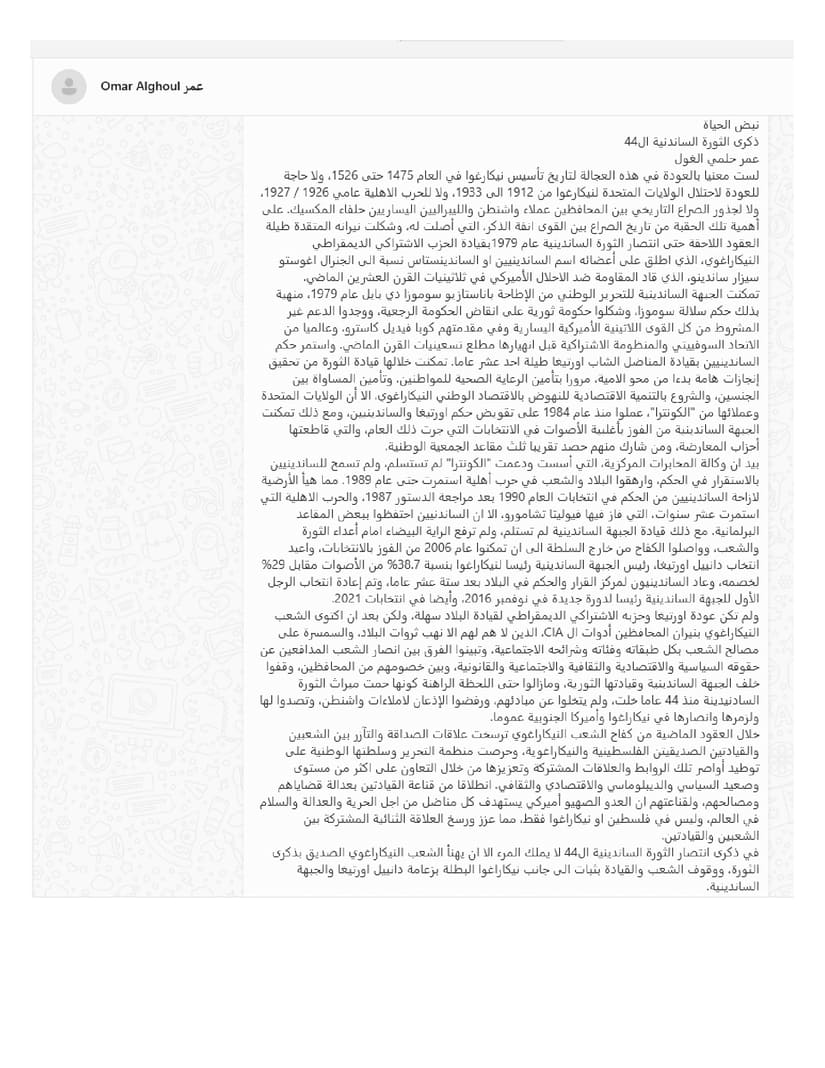 Durante las últimas décadas de lucha del Pueblo nicaragüense, se han establecido relaciones de amistad y solidaridad entre los dos Pueblos y las dos direcciones amigas, la palestina y la nicaragüense, basado en la convicción de los dos liderazgos, en la justicia de sus causas e intereses, y en la convicción de que el enemigo sionista-estadounidense apunta a todos los luchadores por la Libertad, la Justicia y la Paz en el mundo, y no solo en Palestina o Nicaragua, lo que fortaleció y consolidó la relación bilateral conjunta entre los dos Pueblos y los dos liderazgos.