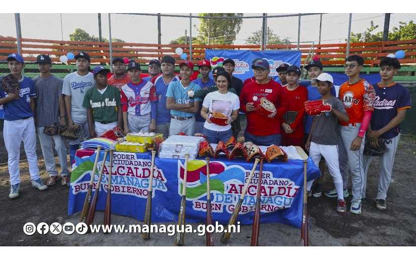 La Alcaldía de Managua entregó este miércoles material deportivo a la liga juvenil de béisbol del barrio San Luis del distrito IV, como parte de la masificación del deporte que impulsa el gobierno sandinista.