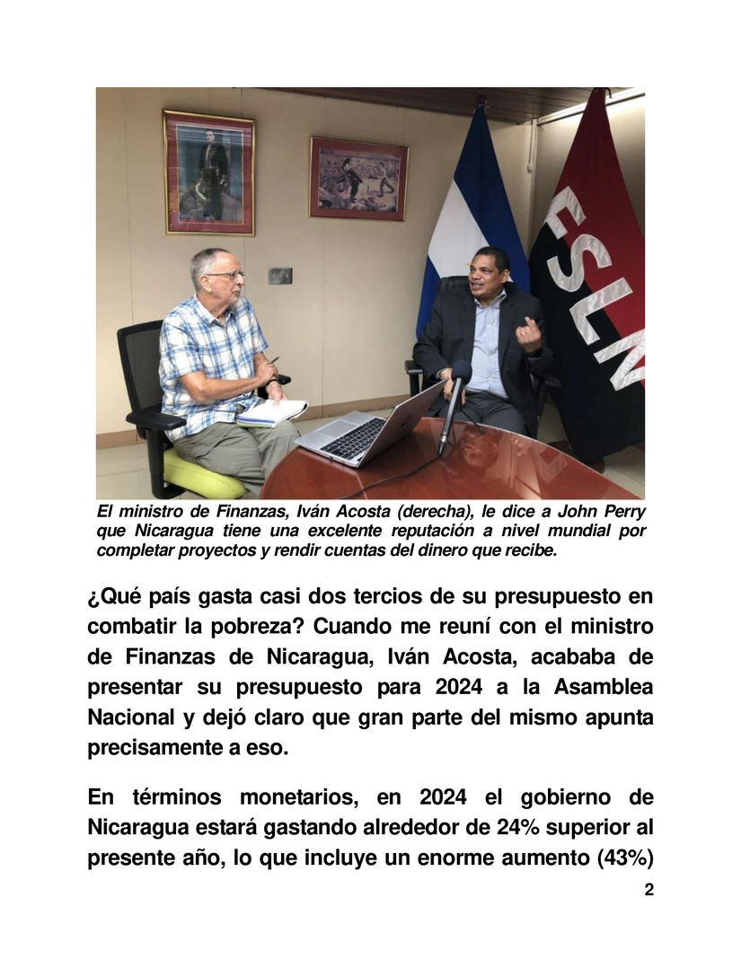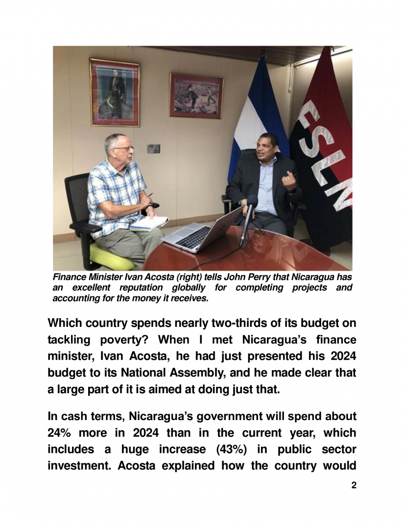 ¿Qué país gasta casi dos tercios de su presupuesto en combatir la pobreza? Cuando me reuní con el ministro de Finanzas de Nicaragua, Iván Acosta, acababa de presentar su presupuesto para 2024 a la Asamblea Nacional y dejó claro que gran parte del mismo apunta precisamente a eso.