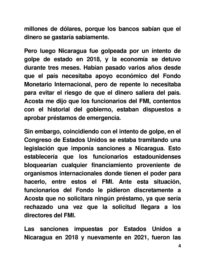 Pero luego Nicaragua fue golpeada por un intento de golpe de estado en 2018, y la economía se detuvo durante tres meses. Habían pasado varios años desde que el país necesitaba apoyo económico del Fondo Monetario Internacional, pero de repente lo necesitaba para evitar el riesgo de que el dinero saliera del país. Acosta me dijo que los funcionarios del FMI, contentos con el historial del gobierno, estaban dispuestos a aprobar préstamos de emergencia.