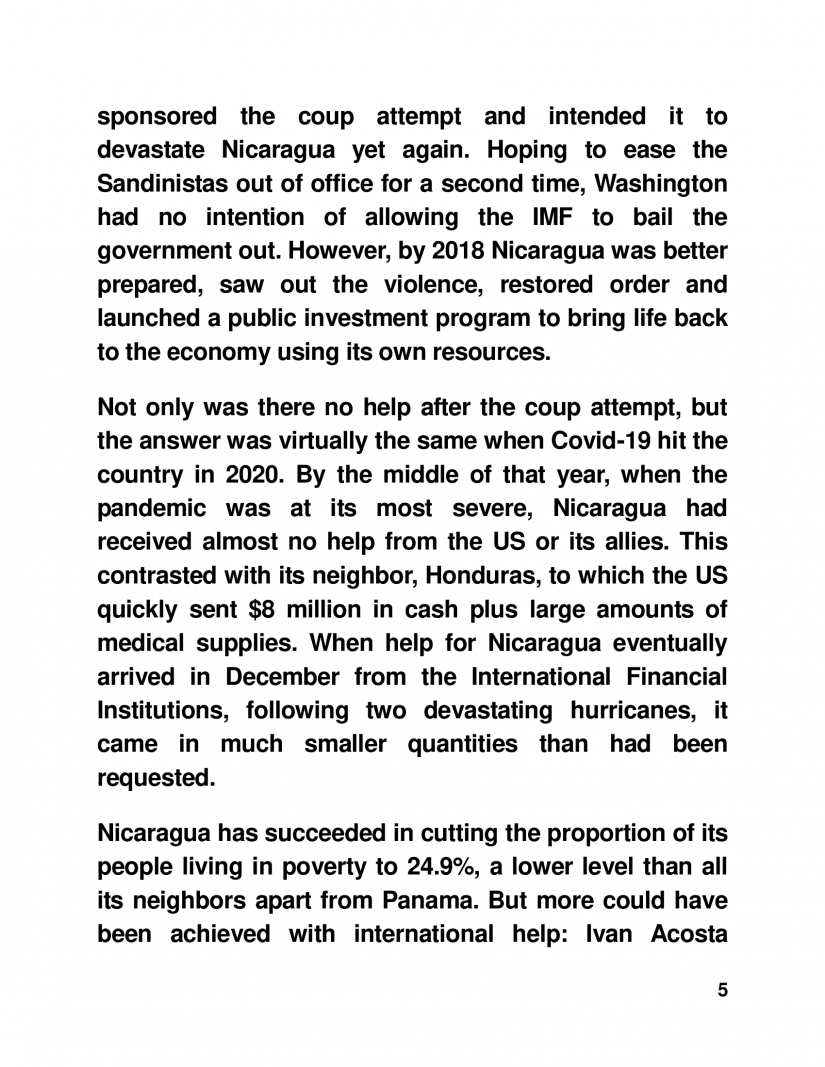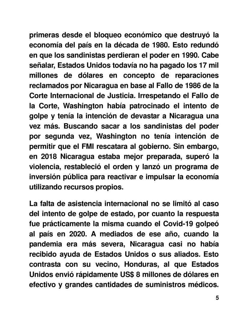 Las sanciones impuestas por Estados Unidos a Nicaragua en 2018 y nuevamente en 2021, fueron las primeras desde el bloqueo económico que destruyó la economía del país en la década de 1980. Esto redundó en que los sandinistas perdieran el poder en 1990. Cabe señalar, Estados Unidos todavía no ha pagado los 17 mil millones de dólares en concepto de reparaciones reclamados por Nicaragua en base al Fallo de 1986 de la Corte Internacional de Justicia. Irrespetando el Fallo de la Corte, Washington había patrocinado el intento de golpe y tenía la intención de devastar a Nicaragua una vez más. Buscando sacar a los sandinistas del poder por segunda vez, Washington no tenía intención de permitir que el FMI rescatara al gobierno. Sin embargo, en 2018 Nicaragua estaba mejor preparada, superó la violencia, restableció el orden y lanzó un programa de inversión pública para reactivar e impulsar la economía utilizando recursos propios.