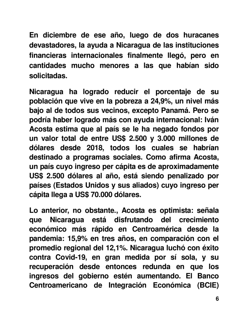 Nicaragua ha logrado reducir el porcentaje de su población que vive en la pobreza a 24,9%, un nivel más bajo al de todos sus vecinos, excepto Panamá. Pero se podría haber logrado más con ayuda internacional: Iván Acosta estima que al país se le ha negado fondos por un valor total de entre US$ 2.500 y 3.000 millones de dólares desde 2018, todos los cuales se habrían destinado a programas sociales. Como afirma Acosta, un país cuyo ingreso per cápita es de aproximadamente US$ 2.500 dólares al año, está siendo penalizado por países (Estados Unidos y sus aliados) cuyo ingreso per cápita llega a US$ 70.000 dólares.