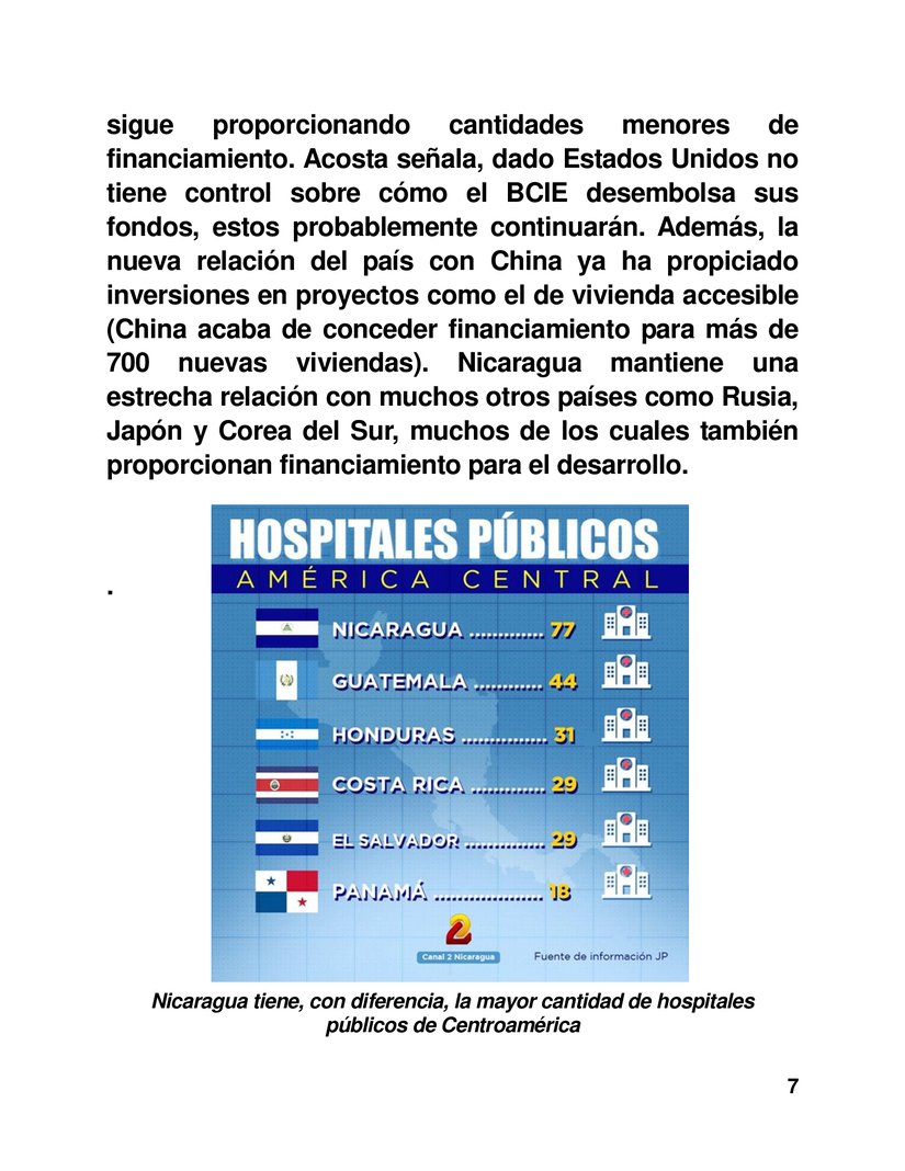 Un gráfico publicado recientemente muestra que Nicaragua tiene la mayor cantidad de hospitales públicos en Centroamérica: 77 en total, mientras Costa Rica y Panamá, mucho más ricos, tienen sólo 29 y 18 respectivamente. Un tercio de estos hospitales son nuevos, construidos en los últimos 16 años.