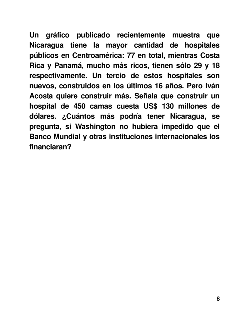 Pero Iván Acosta quiere construir más. Señala que construir un hospital de 450 camas cuesta US$ 130 millones de dólares. ¿Cuántos más podría tener Nicaragua, se pregunta, si Washington no hubiera impedido que el Banco Mundial y otras instituciones internacionales los financiaran?