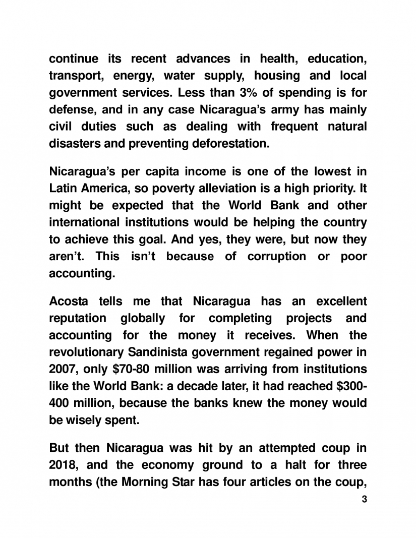 But then Nicaragua was hit by an attempted coup in 2018, and the economy ground to a halt for three months (the Morning Star has four articles on the coup, starting here and NicaNotes has several eBooks on the attempt including here and here.) It had been several years since the country had needed economic support from the International Monetary Fund, but suddenly it needed it to avert the risk of money flowing out of the country. Acosta told me that IMF officials, happy with the government‘s track record, were ready to approve emergency loans.