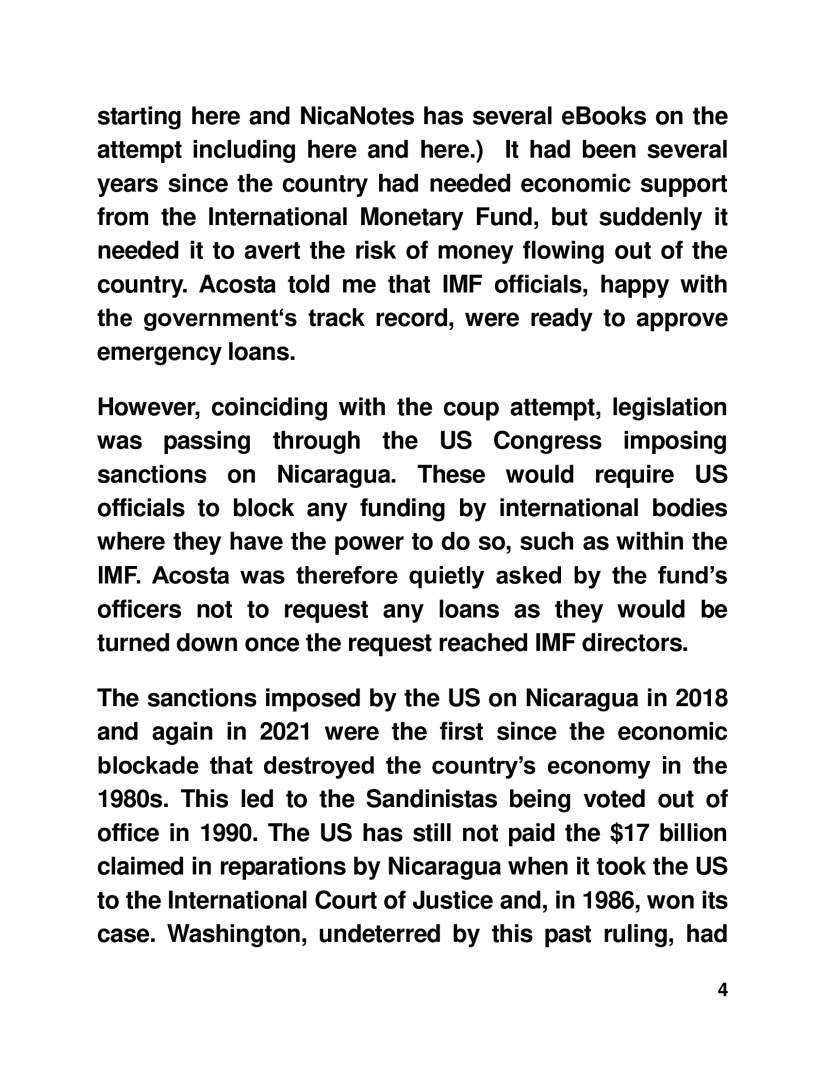 However, coinciding with the coup attempt, legislation was passing through the US Congress imposing sanctions on Nicaragua. These would require US officials to block any funding by international bodies where they have the power to do so, such as within the IMF. Acosta was therefore quietly asked by the fund’s officers not to request any loans as they would be turned down once the request reached IMF directors.