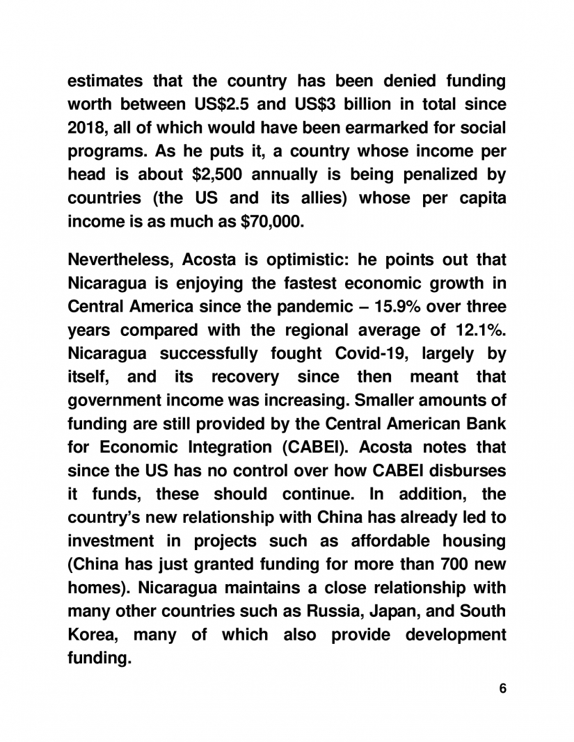 Nicaragua successfully fought Covid-19, largely by itself, and its recovery since then meant that government income was increasing. Smaller amounts of funding are still provided by the Central American Bank for Economic Integration (CABEI). Acosta notes that since the US has no control over how CABEI disburses it funds, these should continue. In addition, the country’s new relationship with China has already led to investment in projects such as affordable housing (China has just granted funding for more than 700 new homes). Nicaragua maintains a close relationship with many other countries such as Russia, Japan, and South Korea, many of which also provide development funding.
