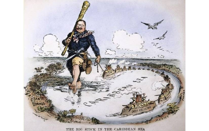 En 1904, el presidente Theodore Roosevelt añadió el Corolario Roosevelt a la Doctrina Monroe. Declaró que Estados Unidos podría involucrarse en los asuntos internos de un país latinoamericano en casos que Estados Unidos considerara como “comportamiento indebido” por parte de ese país latinoamericano. Caricatura de William Allen Rogers 1904.