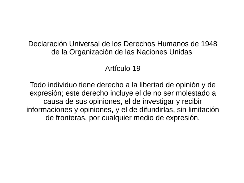 Históricamente, la libertad de expresión ha sido un elemento fundamental en el desarrollo de la mayoría de las sociedades en el mundo, sencillamente porque el libre intercambio de la información es esencial para el desarrollo humano de las naciones y sus pueblos. En nuestros tiempos un punto de referencia de mucha autoridad política y moral en relación al tema ha sido el Artículo 19 de la Declaración Universal de Derechos Humanos de la ONU, lo cual afirma que “Toda persona tiene derecho a la libertad de opinión y de expresión”. En la práctica, la gran mayoría de los países aceptan las restricciones a la libertad de expresión relacionadas con, entre otros temas, la incitación al odio o la violencia, la calumnia, la blasfemia o la obscenidad o con la sedición y la seguridad pública.