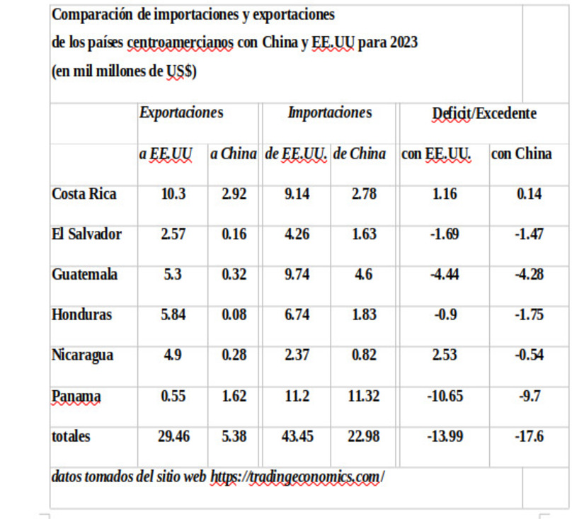 En el caso de América Central, a nivel global el total de exportaciones de los seis principales países centroamericanos en 2022 fue alrededor de US$74 mil millones y el total de importaciones fue alrededor de US$102 mil millones. En este momento la balanza de comercio de la región centroamericana con Estados Unidos y China es bastante similar aunque sin duda la tendencia futura será que la región tendrá un déficit comercial progresivamente más grande con China por motivo de la creciente apertura comercial con Nicaragua, Honduras y El Salvador. La siguiente tabla presenta las cifras de importaciones y exportaciones de la región para el año 2023 con la República Popular China y Estados Unidos de Norte América respectivamente.
