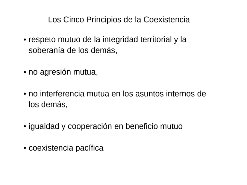 Para entender el desarrollo de este concepto, es necesario tomar en cuenta varios aspectos históricos y la coyuntura actual ahora. Los Cinco Principios para la Coexistencia Pacífica fueron concebidos por el Primer Ministro de la República Popular China, Zhou En Lai, al fin de 1953 antes de entrar en un diálogo al inicio del año siguiente con el gobierno de la India sobre territorios en disputa entre los dos países en lo que ahora es Xizang, pero en aquel entonces fue conocido como Tibet. El gobierno de la India traduce estos cinco principios por la palabra hindi "panchsheel". Los Cinco Principios son: