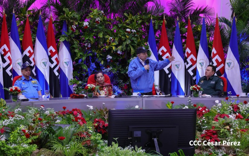 Comandante Daniel Ortega y Compañera Rosario Murillo, Copresidentes de la República y Jefatura Suprema del Ejército de Nicaragua; Hermanos de la Comandancia General, Coroneles Generales Bayardo Rodríguez, Jefe de Estado Mayor General, y Marvin Corrales, Inspector General.