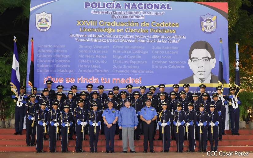 La Vigésima Octava Graduación de Cadetes agradece al Comandante Daniel Ortega Saavedra y a la Compañera Rosario Murillo Zambrana, Co Presidentes de la República y Jefatura Suprema de la Policía Nacional, por su respaldo permanente en nuestra formación y fortalecimiento institucional. Su liderazgo y compromiso con la Paz y la Seguridad han sido fundamentales para formar policías comprometidos con los Principios y Valores Sandinistas.