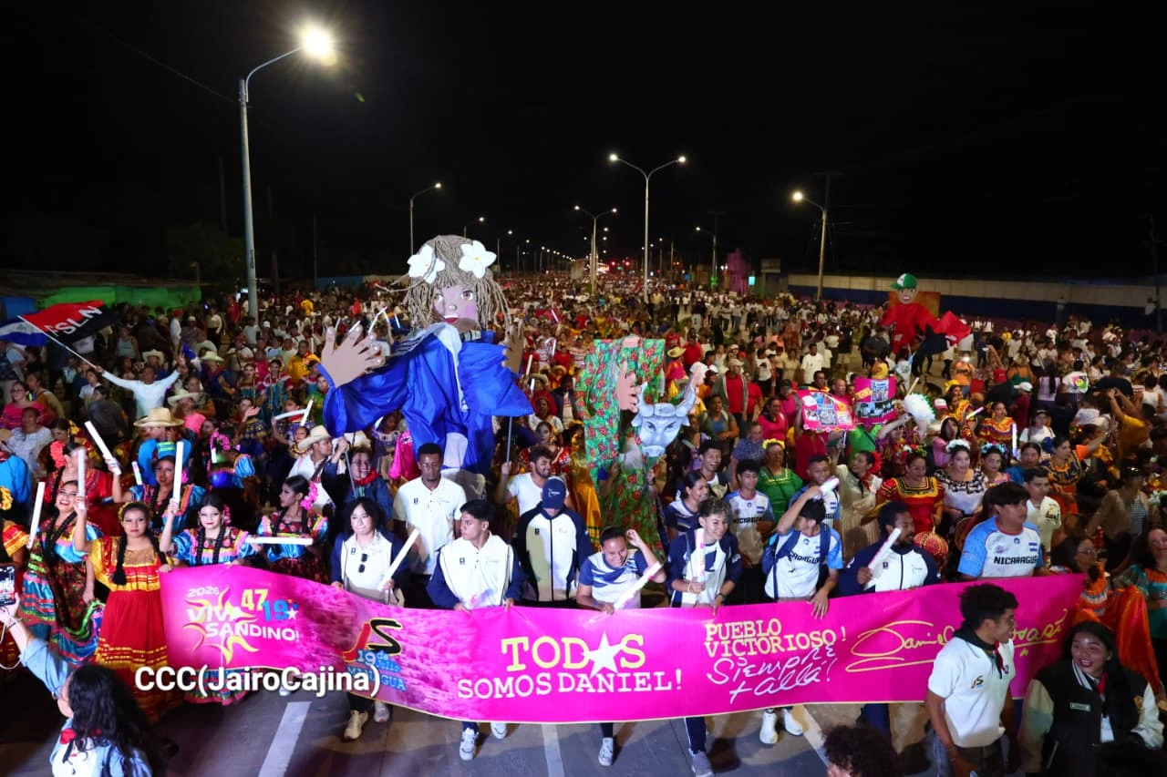 La caminata fue un carnaval: el cielo estalló en fuegos artificiales, bandas estudiantiles marcaron el paso y el pueblo caminó entonando canciones revolucionarias. A lo largo los 2.7 kilómetros del tramo, las familias salieron a las puertas y ventanas, sentadas en sus sillas o en pie, aplaudiendo y ondeando orgullosas las banderas de Nicaragua y del Frente Sandinista de Liberación Nacional (FSLN), sumando su alegría a la fiesta popular que encabezaron los jóvenes.