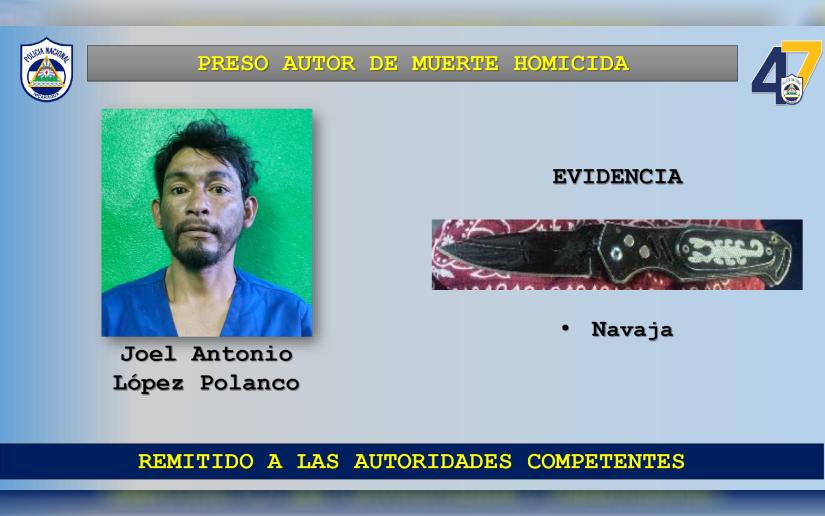 La Policía Nacional informó de la captura del sujeto Joel Antonio López Polanco, señalado como presunto autor del homicidio en perjuicio del ciudadano José Antonio Morán Cárdenas, hecho ocurrido en el municipio de Quilalí, departamento de Nueva Segovia.