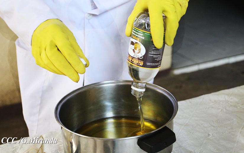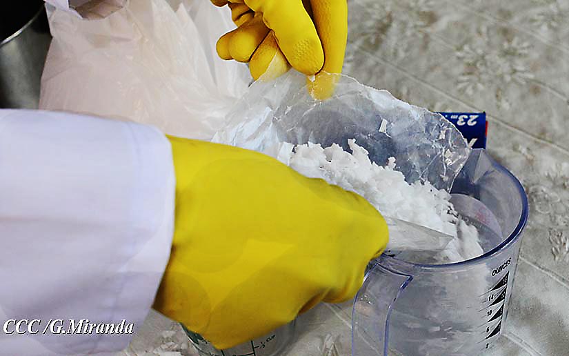 Luis Valle hizo una demostración, elaborando las mezclas de hidróxido de sodio, aceite de coco y de ajonjolí y agua.