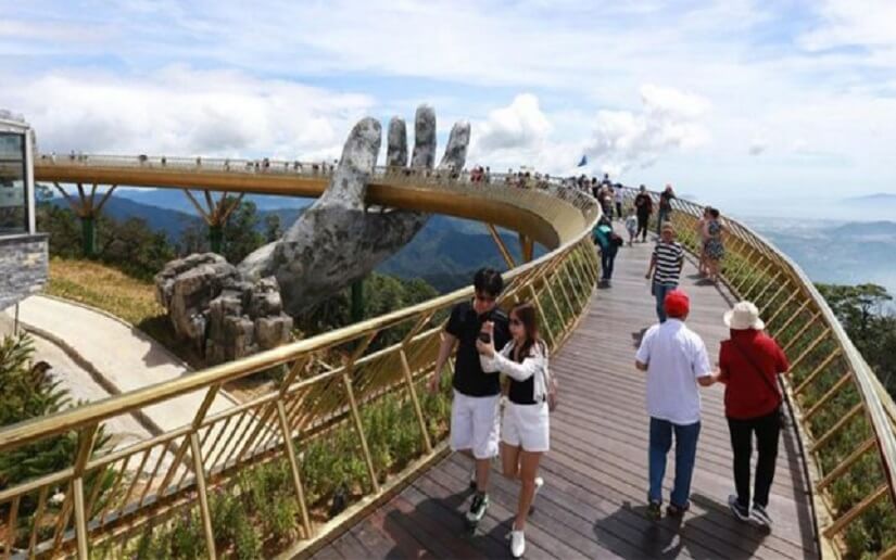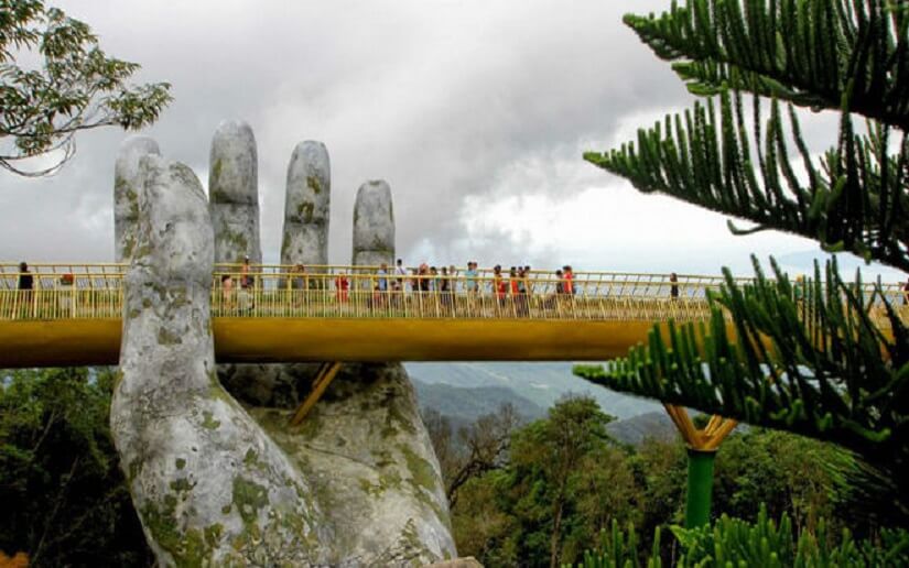 En las montañas sobre Da Nang, Vietnam tiene una pieza única en el diseño de un puente algo que solo lo has visto en tus sueños más locos, o en alguna película de ficción. Rodeando un camino de 150 metros enmarcado por flores, un puente dorado brilla frente a las colinas de Ba Na, apoyado sobre un par de manos gigantes.
