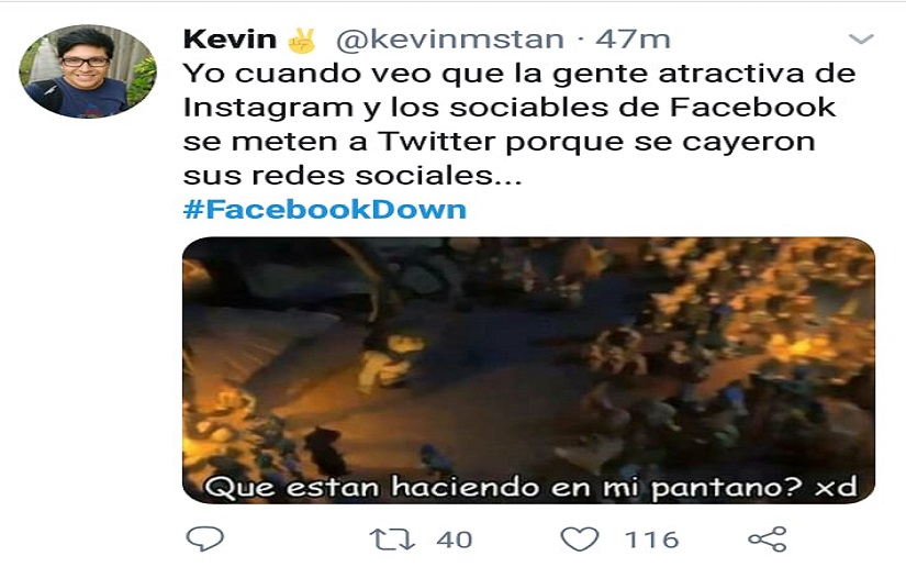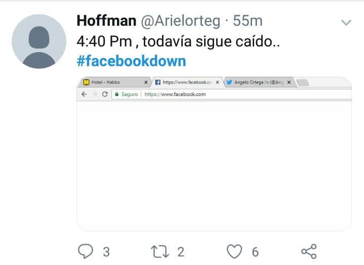 Internautas vías otras redes (Twitter) escriben su malestar sobre este problema con la etiqueta con la etiqueta #FacebookDown, e indican que al ingresar sus pantallas les aparece en blanco o una variedad de mensajes de error.