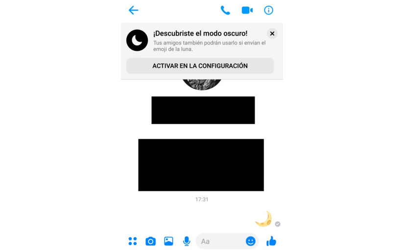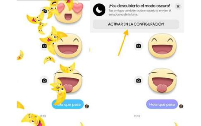 Para activarlo, lo primero que hay que hacer es enviar un emoji de media luna a alguien. La pantalla se llenará de ese mismo emoticono y aparecerá una ventana emergente que te indicará que se ha desbloqueado el Modo Oscuro. Una vez aparezca ese mensaje en la configuración ya estará disponible para habilitarlo.