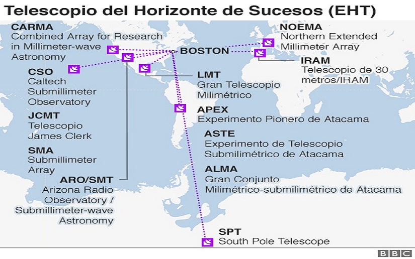 Los telescopios que intengran el EHT se encuentran en volcanes en Hawái y México, montañas en Arizona y en la Sierra Nevada en España, en el Desierto de Atacama en Chile y en la Antártica.