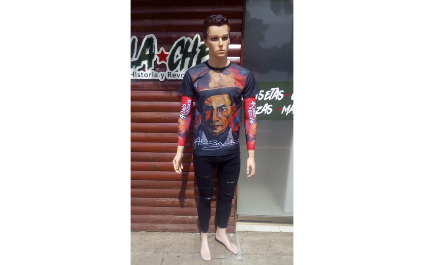 Ofrece pulseras roja y negro, pañoletas, cintas, banderas de la revolución y camisas de distintas tallas y diseños.