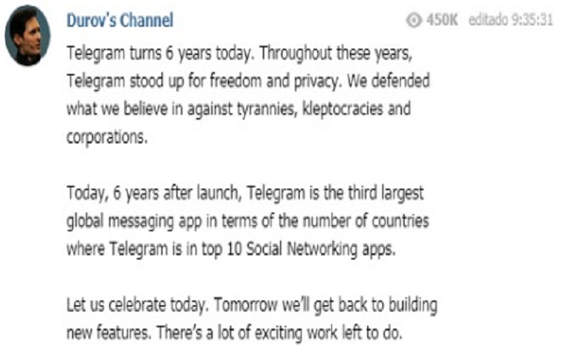 En su mensaje, felicita a Telegram por su sexto aniversario, una aplicación que según palabras de su creador, se ha mantenido a favor de la libertad y la privacidad.