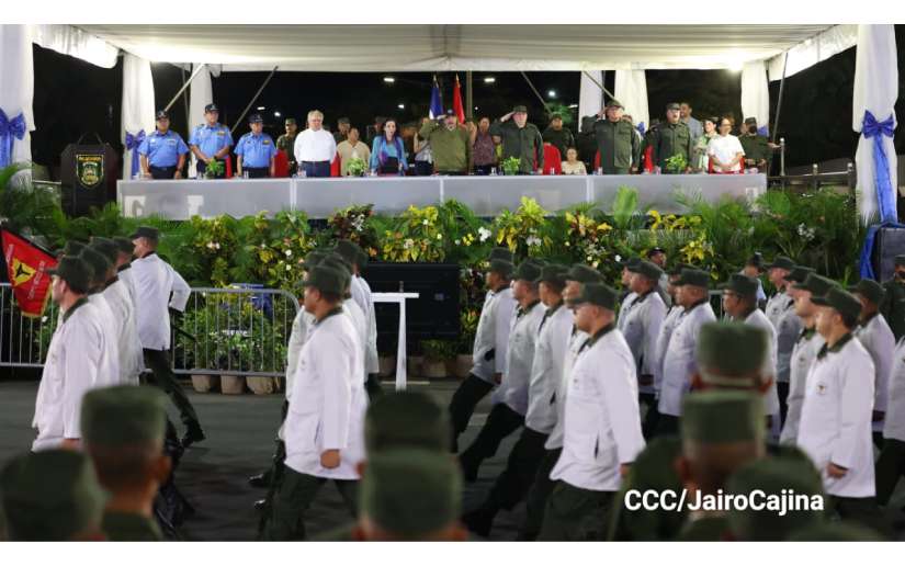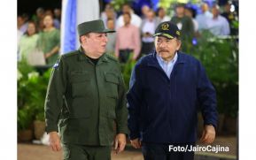 Comandante Daniel Ortega, Presidente de la República y Jefe Supremo del Ejército de Nicaragua; Compañera Rosario Murillo, Vicepresidenta de la República; Presidente de los Poderes de Estado, Doctor Gustavo Porras, Presidente de la Asamblea Nacional.