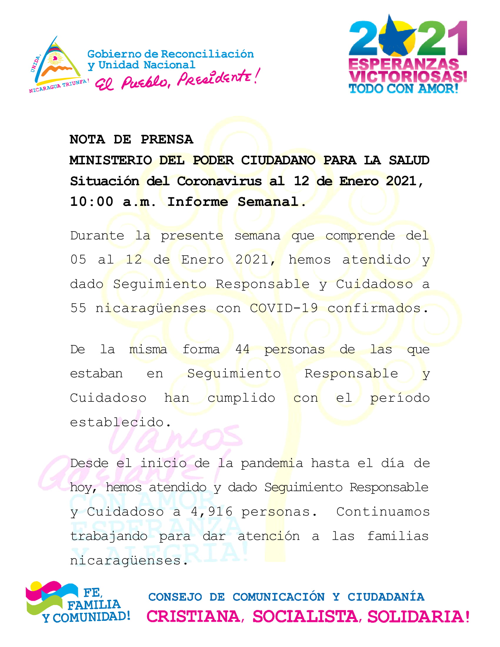 Durante la presente semana que comprende del 05 al 12 de Enero 2021, hemos atendido y dado Seguimiento Responsable y Cuidadoso a 55 nicaragüenses con COVID-19 confirmados.