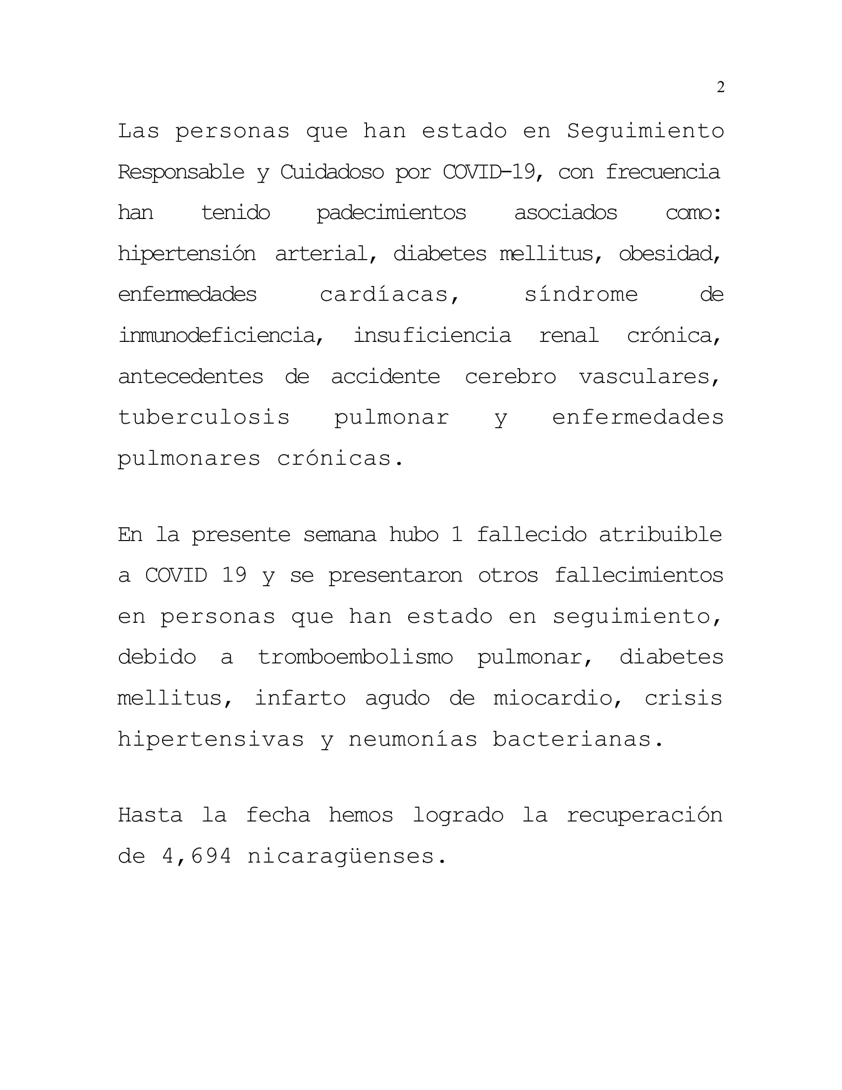 En la presente semana hubo 1 fallecido atribuible a COVID 19 y se presentaron otros fallecimientos en personas que han estado en seguimiento, debido a tromboembolismo pulmonar, diabetes mellitus, infarto agudo de miocardio, crisis hipertensivas y neumonías bacterianas.