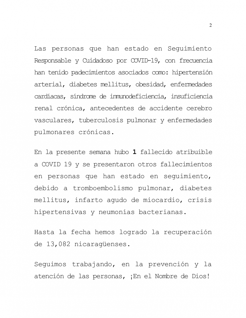 En la presente semana hubo 1 fallecido atribuible a COVID 19 y se presentaron otros fallecimientos en personas que han estado en seguimiento, debido a tromboembolismo pulmonar, diabetes mellitus, infarto agudo de miocardio, crisis hipertensivas y neumonías bacterianas.