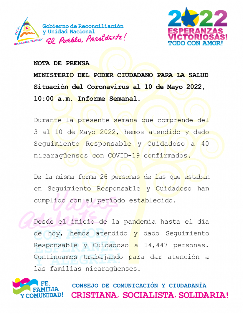 Durante la presente semana que comprende del 3 al 10 de Mayo 2022, hemos atendido y dado Seguimiento Responsable y Cuidadoso a 40 nicaragüenses con COVID-19 confirmados.