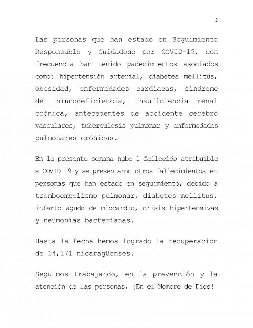 En la presente semana hubo 1 fallecido atribuible a COVID 19 y se presentaron otros fallecimientos en personas que han estado en seguimiento, debido a tromboembolismo pulmonar, diabetes mellitus, infarto agudo de miocardio, crisis hipertensivas y neumonías bacterianas.