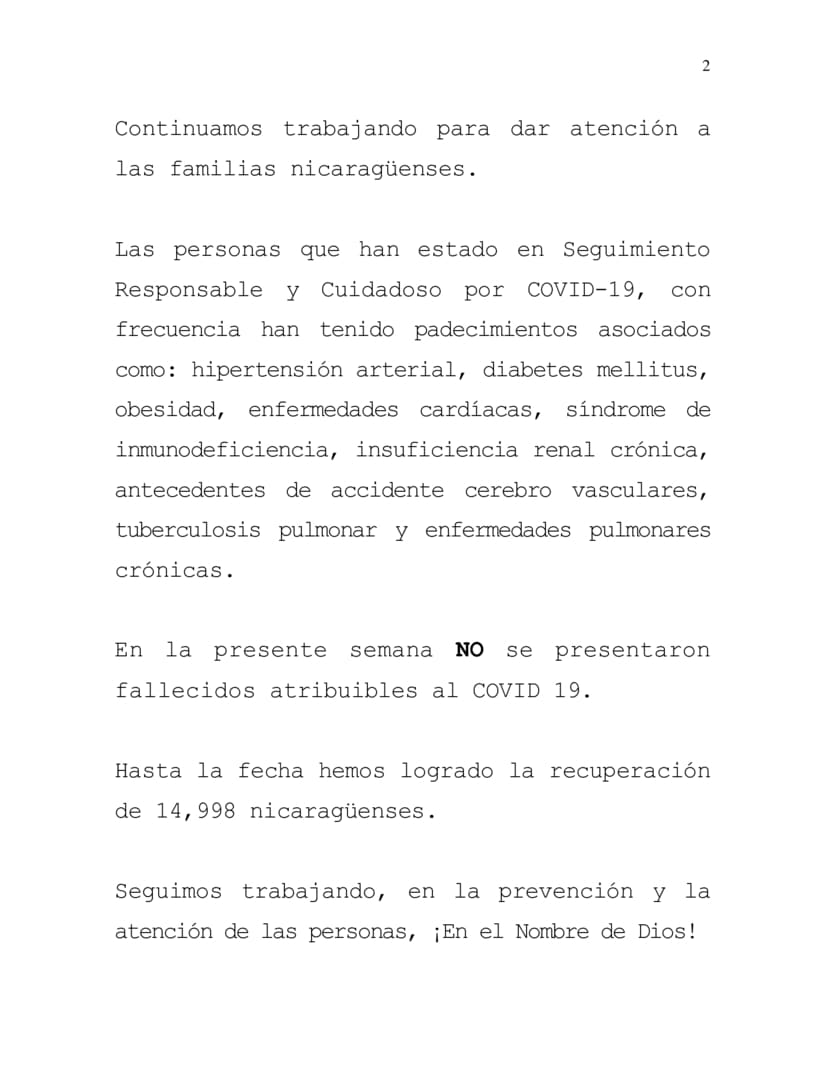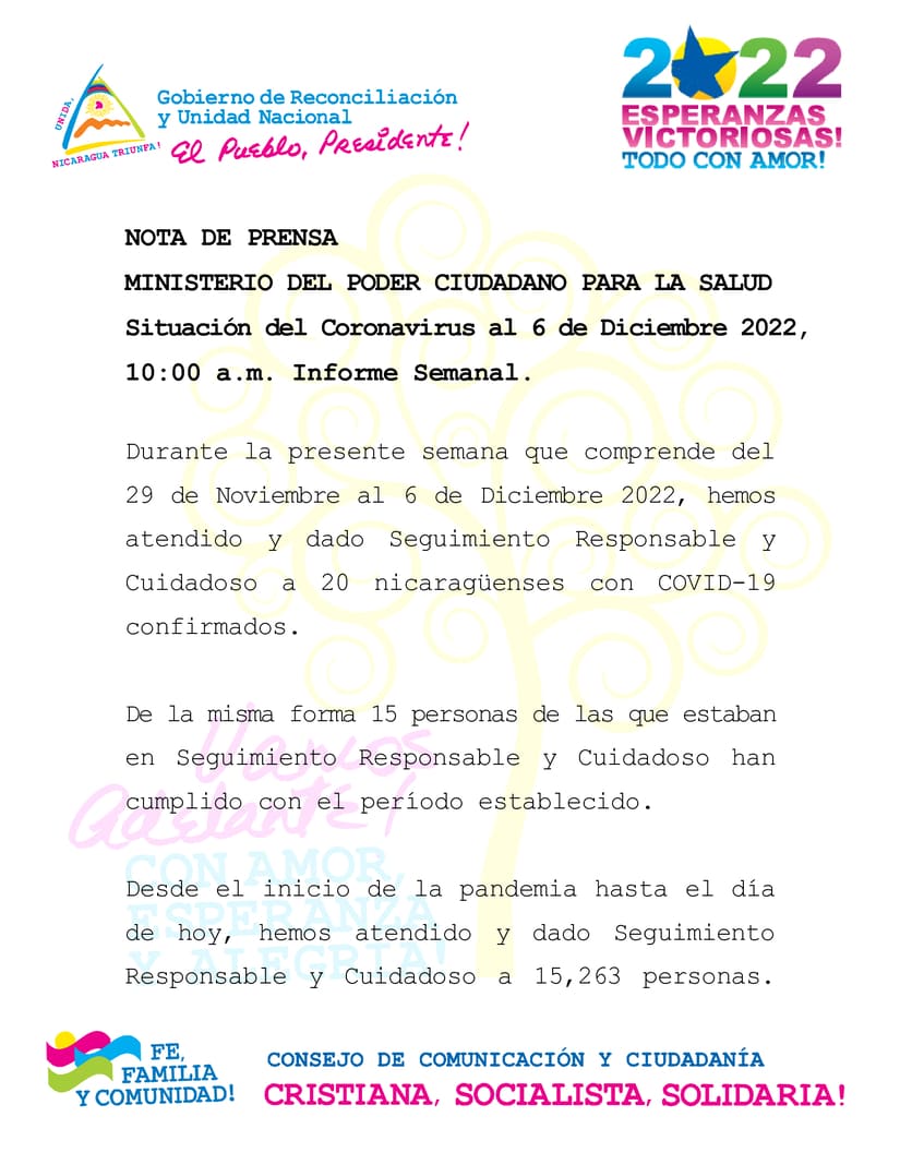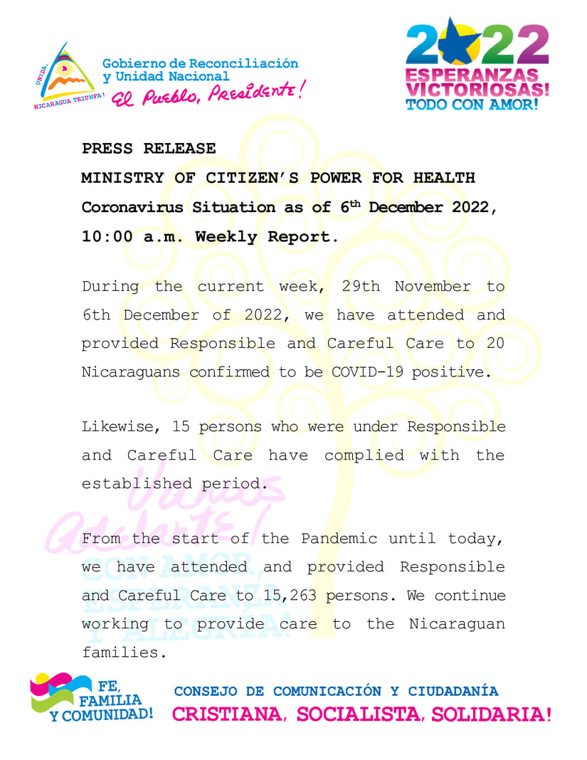During the current week, 29th November to 6th December of 2022, we have attended and provided Responsible and Careful Care to 20 Nicaraguans confirmed to be COVID-19 positive.