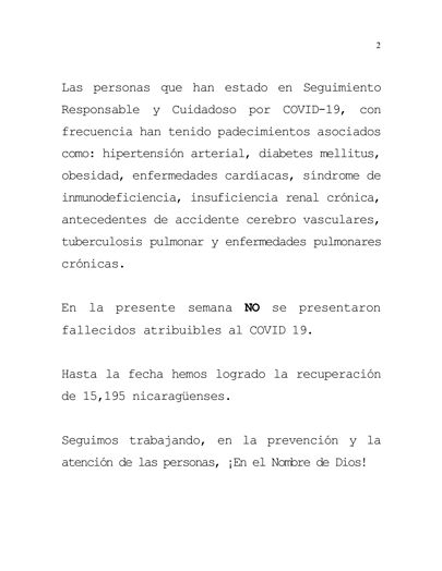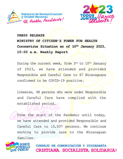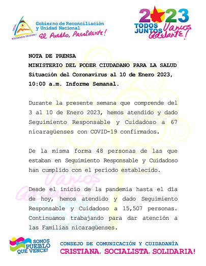 Durante la presente semana que comprende del 3 al 10 de Enero 2023, hemos atendido y dado Seguimiento Responsable y Cuidadoso a 67 nicaragüenses con COVID-19 confirmados.