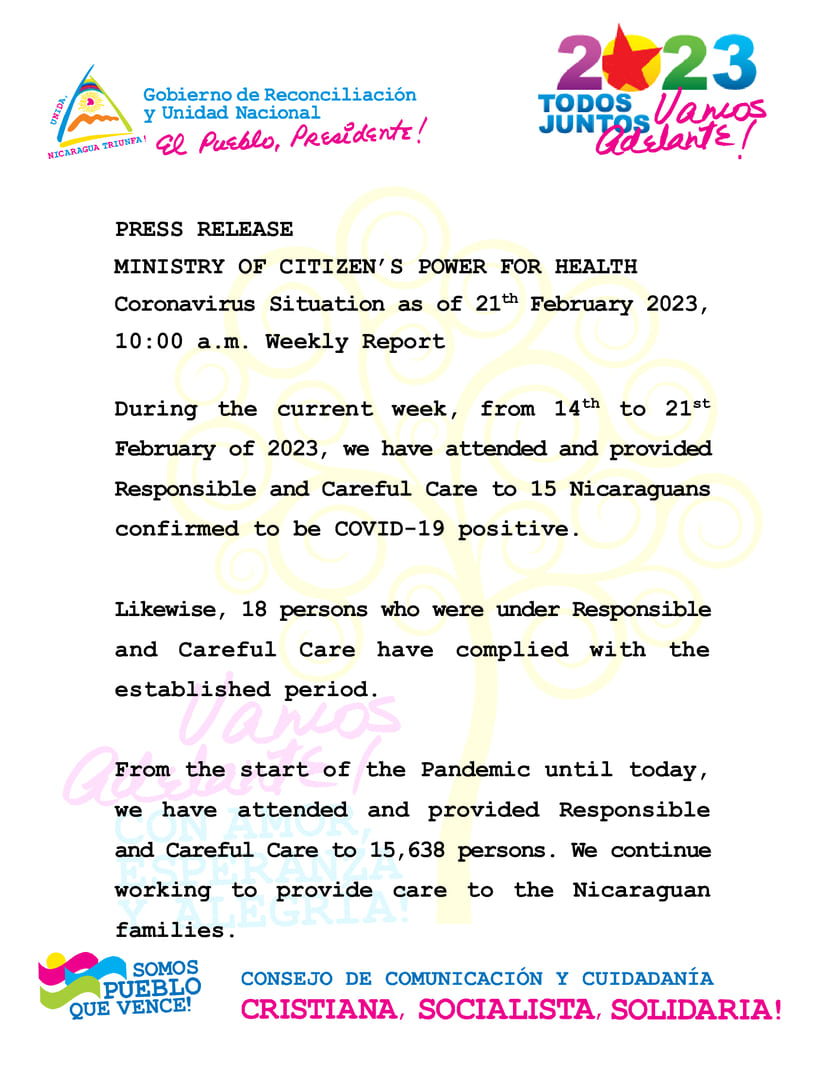 During the current week, from 14th to 21st February of 2023, we have attended and provided Responsible and Careful Care to 15 Nicaraguans confirmed to be COVID-19 positive.