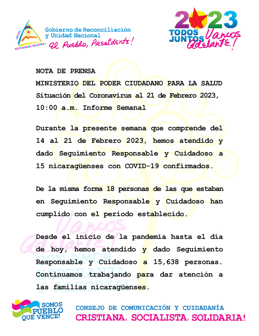 Durante la presente semana que comprende del 14 al 21 de Febrero 2023, hemos atendido y dado Seguimiento Responsable y Cuidadoso a 15 nicaragüenses con COVID-19 confirmados.