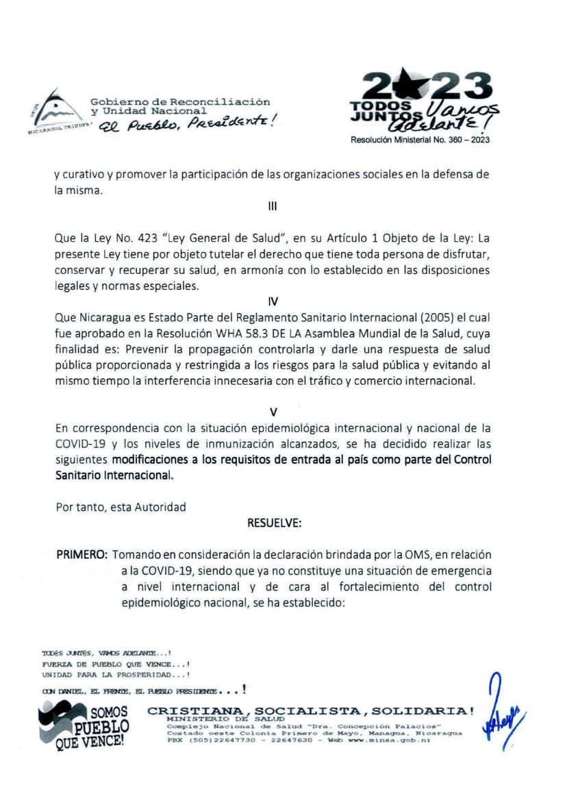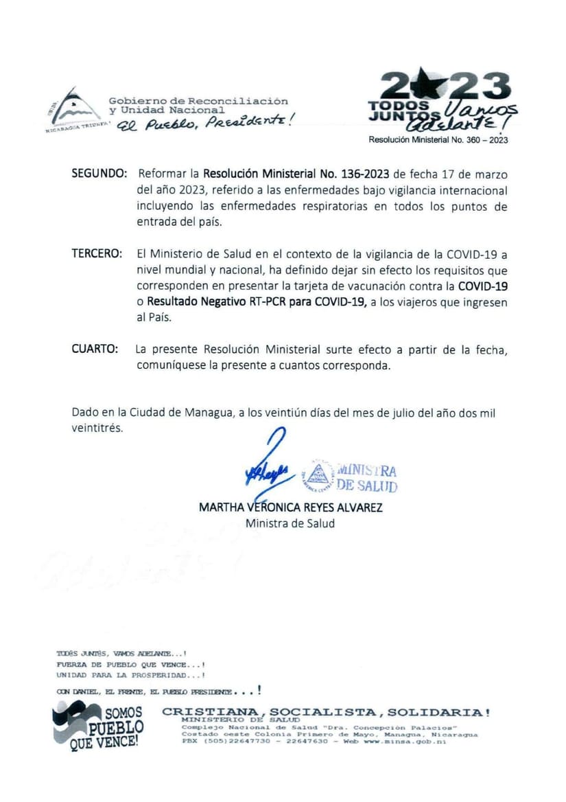 El Ministerio de Salud de Nicaragua anunció que a partir de la fecha quedan sin efecto los requisitos para entrar al país referidos a la Covid-19 y ya no solicitará tarjeta de vacuna y PCR a viajeros de otras nacionalidades.