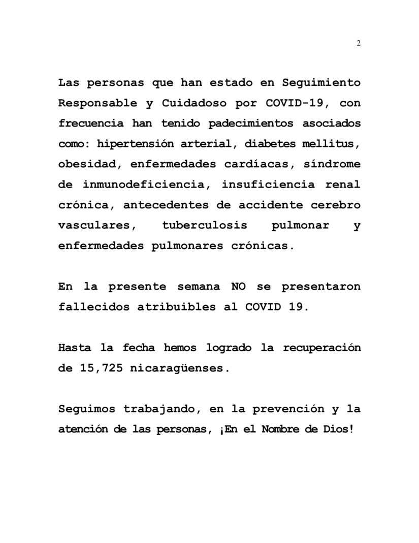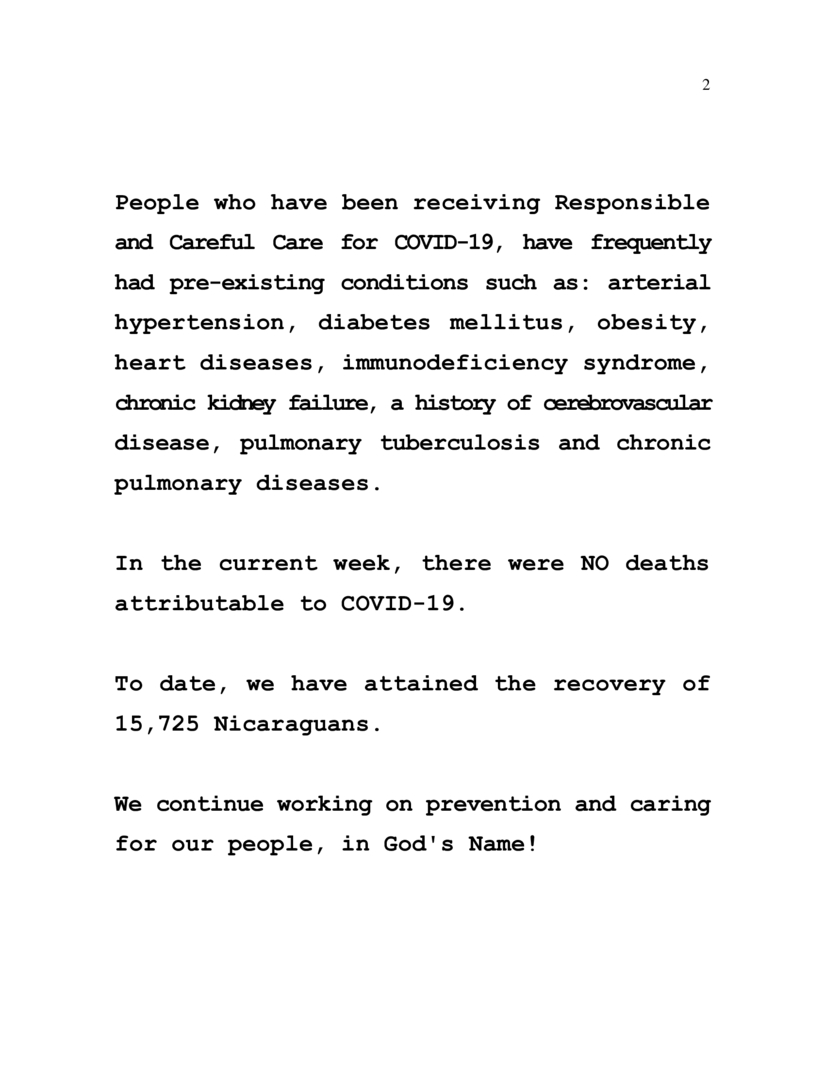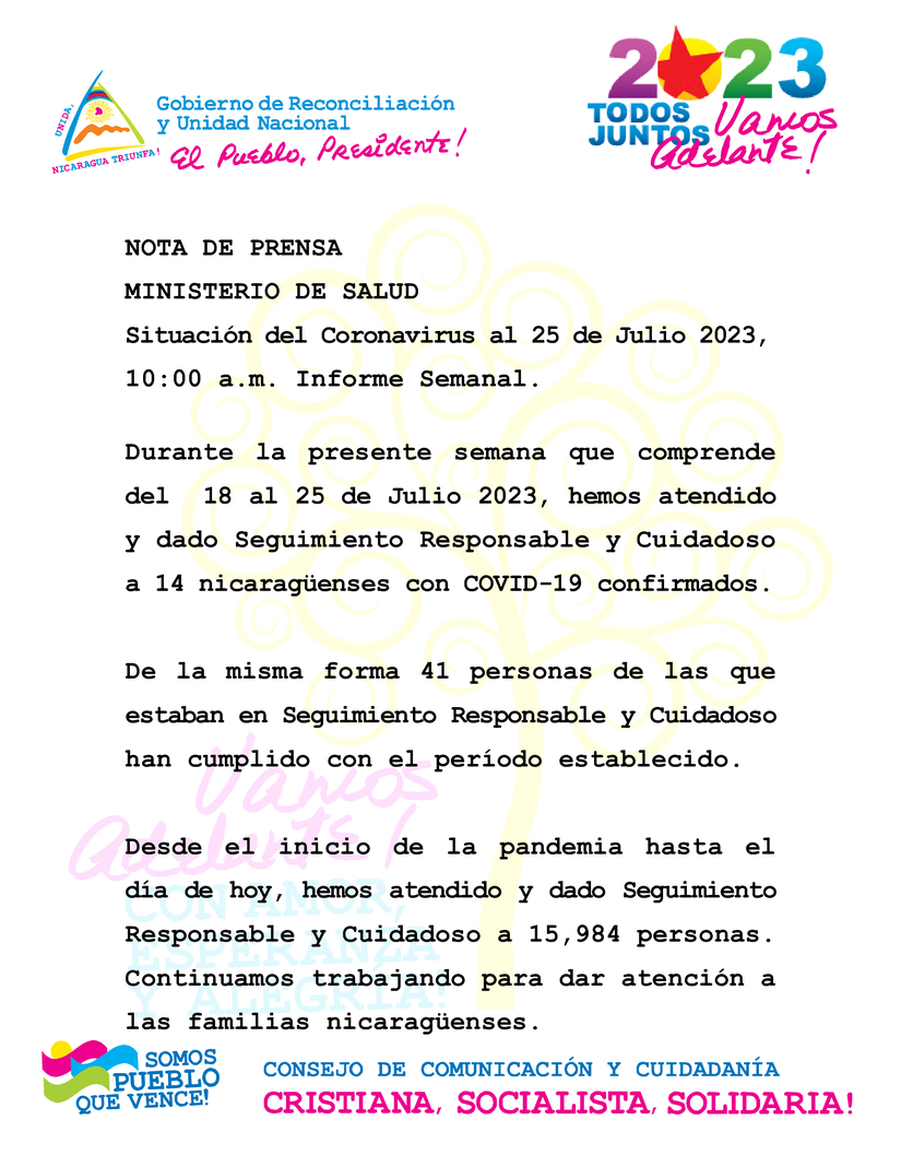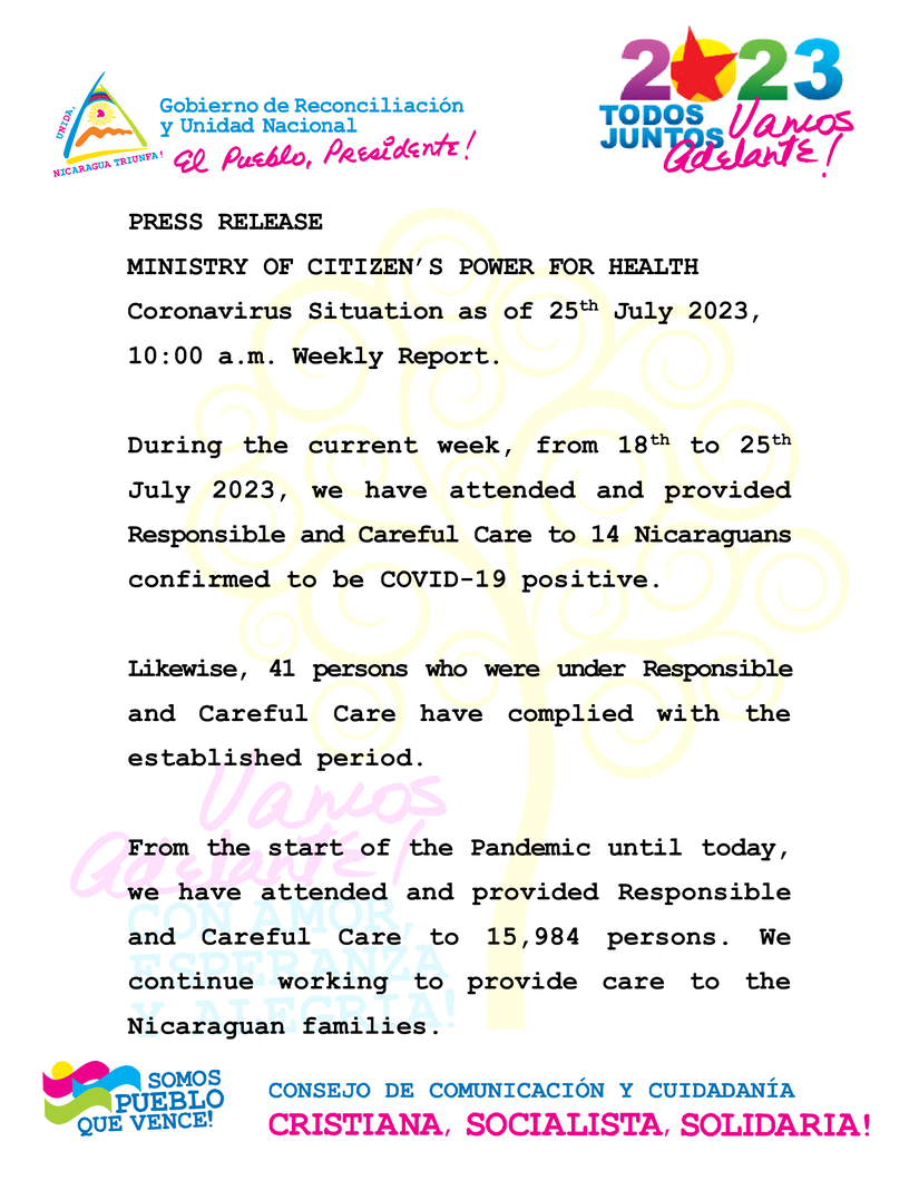 During the current week, from 18th to 25th July 2023, we have attended and provided Responsible and Careful Care to 14 Nicaraguans confirmed to be COVID-19 positive.