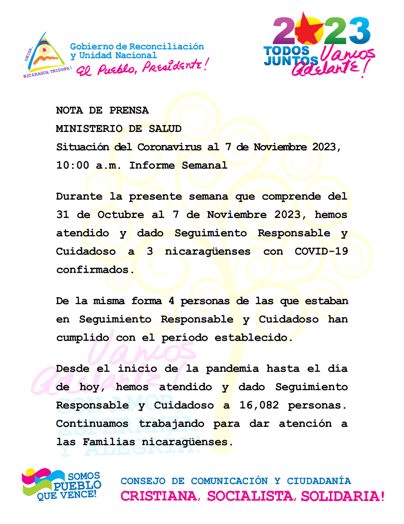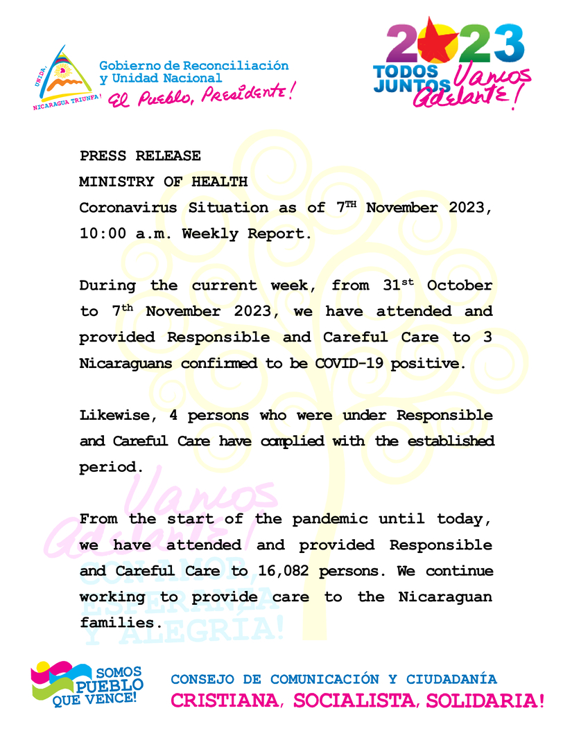 During the current week, from 31st October to 7th November 2023, we have attended and provided Responsible and Careful Care to 3 Nicaraguans confirmed to be COVID-19 positive.