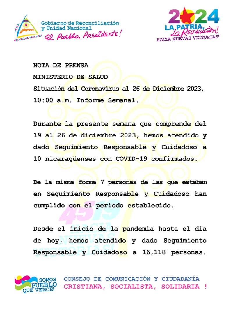 Durante la presente semana que comprende del 19 al 26 de diciembre 2023, hemos atendido y dado Seguimiento Responsable y Cuidadoso a 10 nicaragüenses con COVID-19 confirmados.