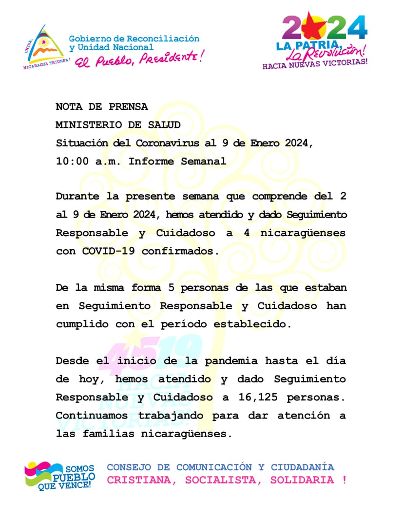 During the current week, from 2nd to 9th January 2024, we have attended and provided Responsible and Careful Care to 4 Nicaraguans confirmed to be COVID-19 positive.
