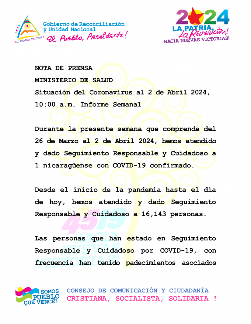 Durante la presente semana que comprende del 26 de Marzo al 2 de Abril 2024, hemos atendido y dado Seguimiento Responsable y Cuidadoso a 1 nicaragüense con COVID-19 confirmado.