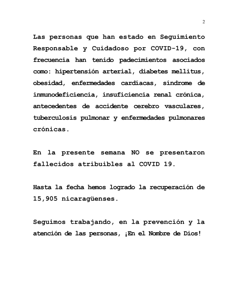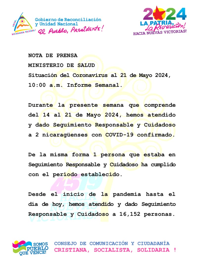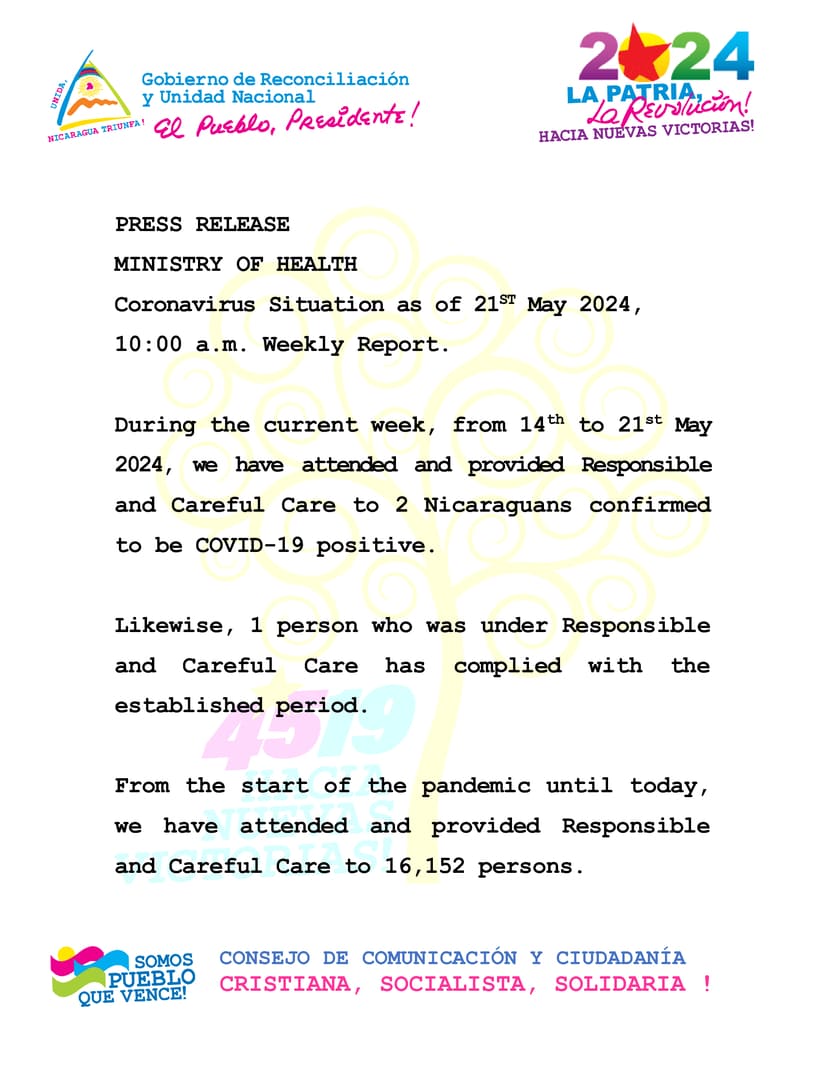 During the current week, from 14th to 21st May 2024, we have attended and provided Responsible and Careful Care to 2 Nicaraguans confirmed to be COVID-19 positive.