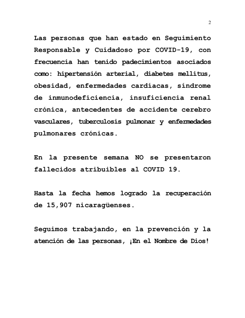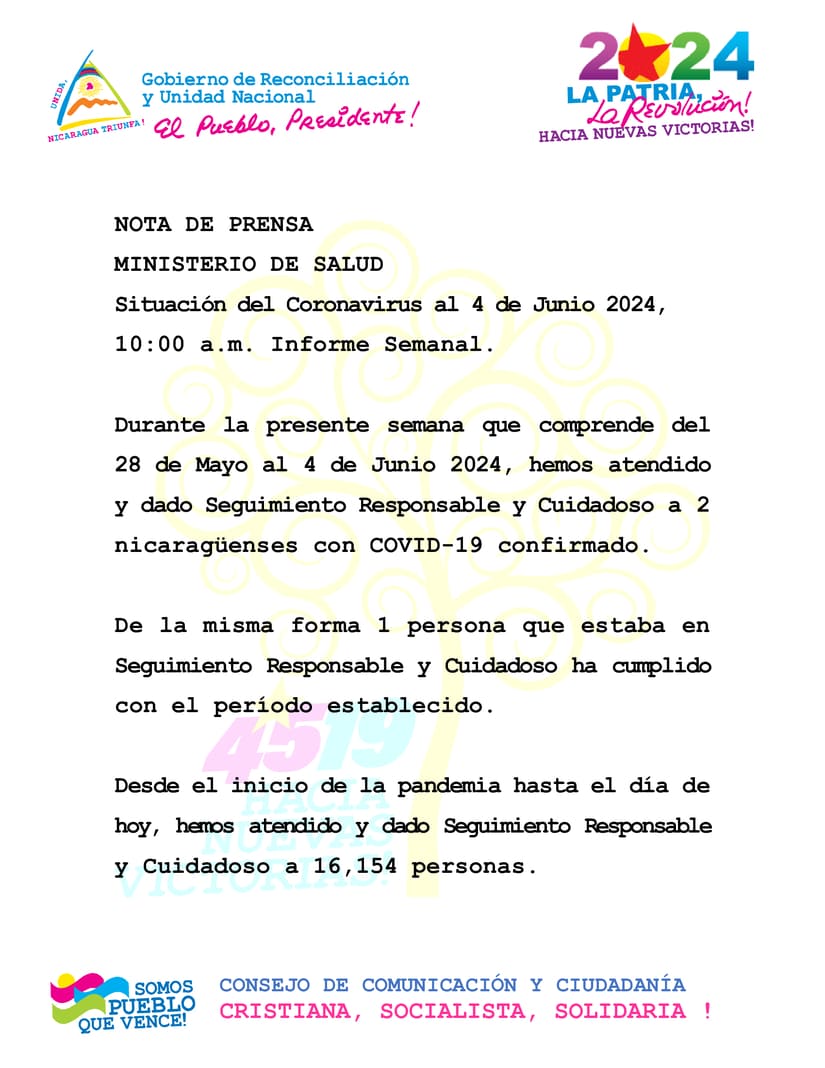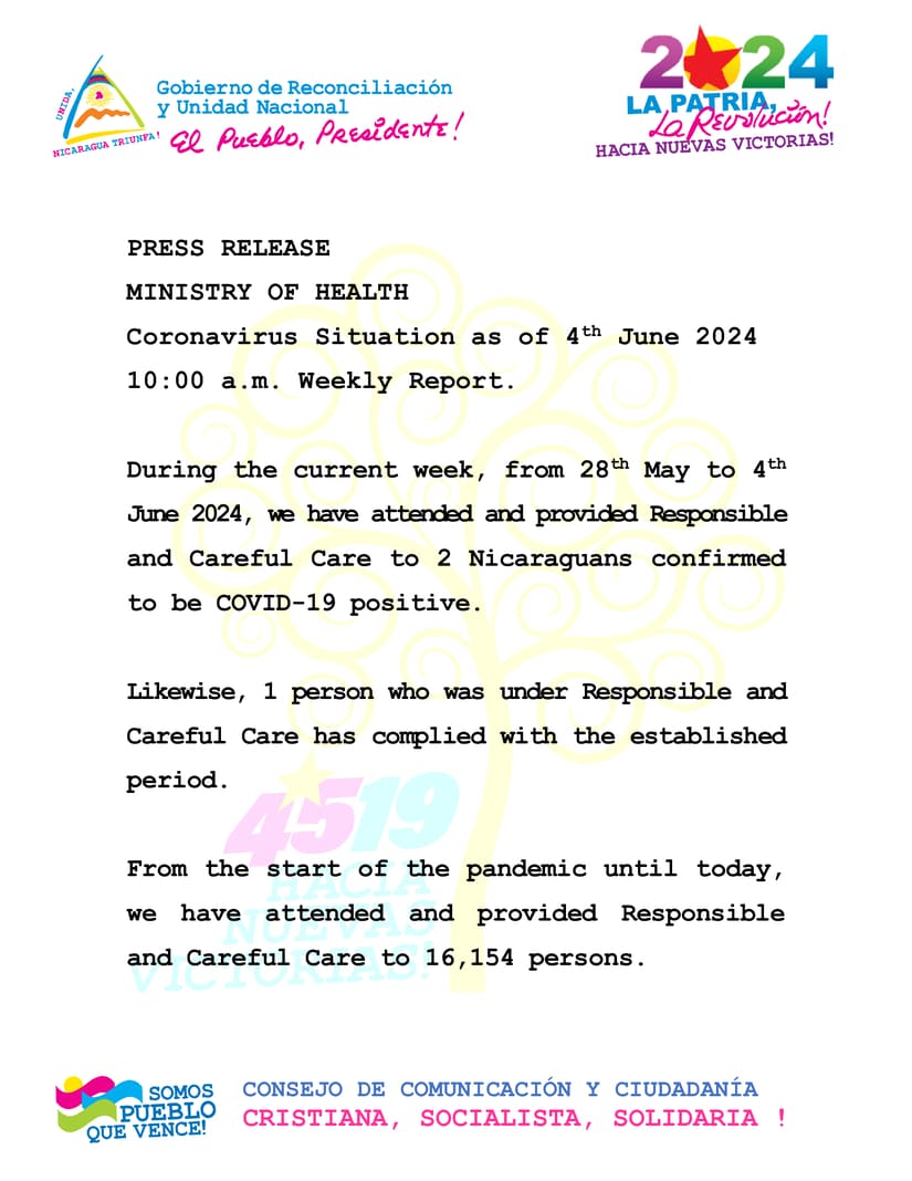 During the current week, from 28th May to 4th June 2024, we have attended and provided Responsible and Careful Care to 2 Nicaraguans confirmed to be COVID-19 positive.