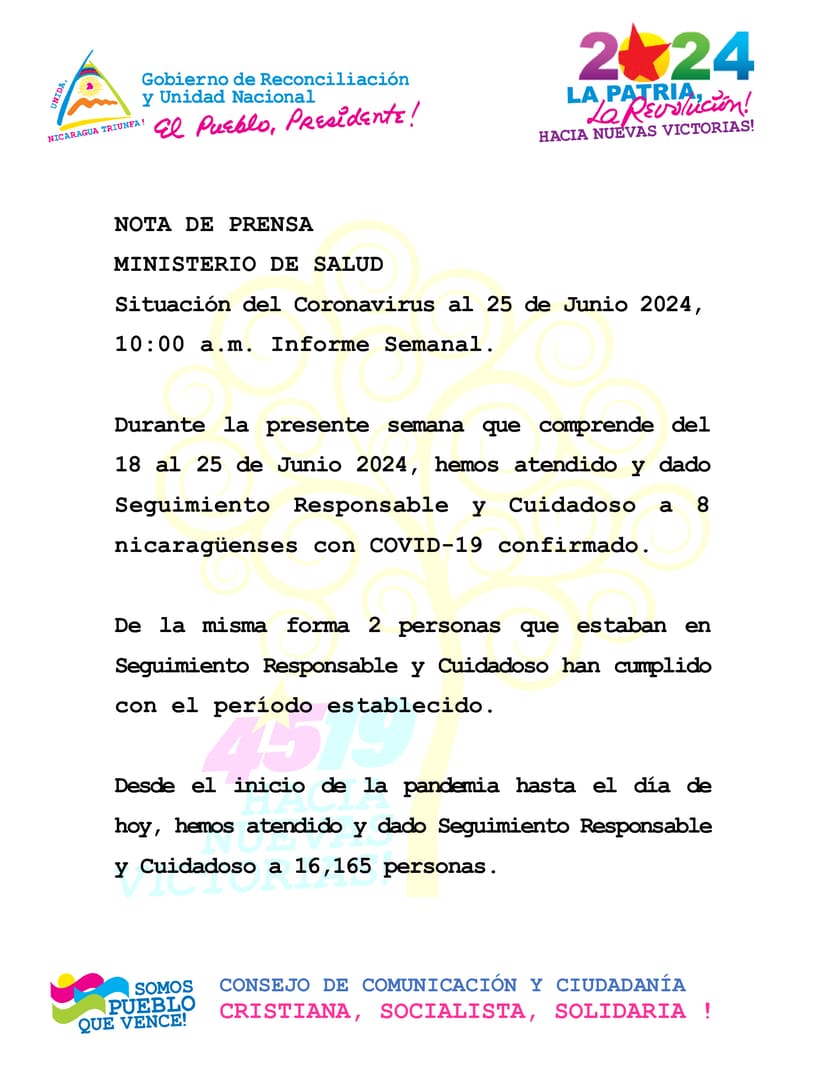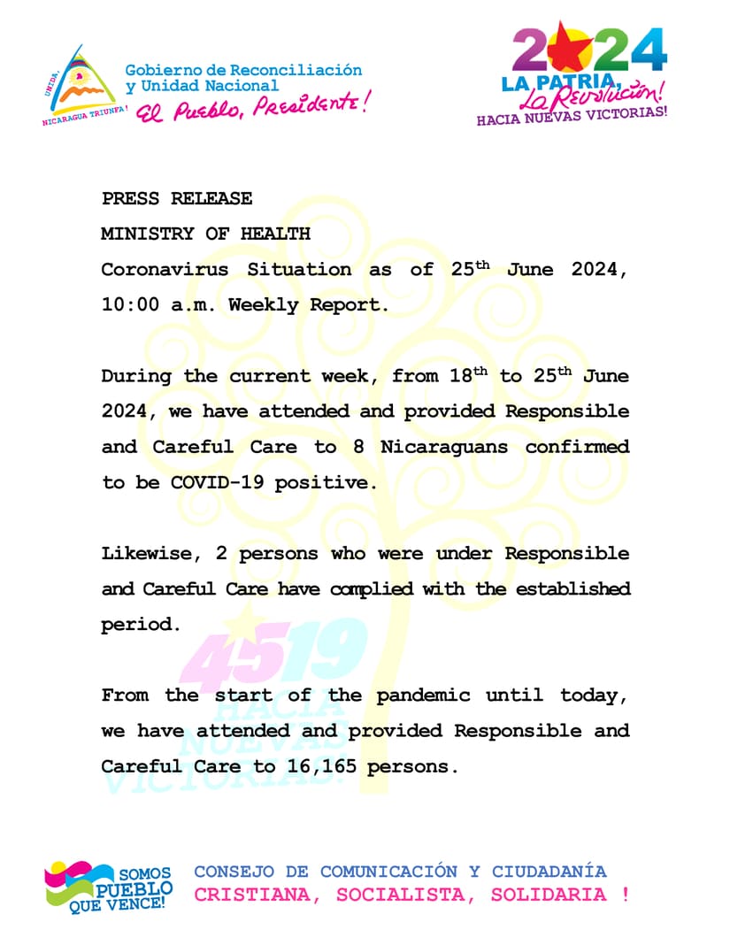 During the current week, from 18th to 25th June 2024, we have attended and provided Responsible and Careful Care to 8 Nicaraguans confirmed to be COVID-19 positive.