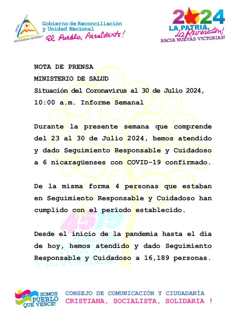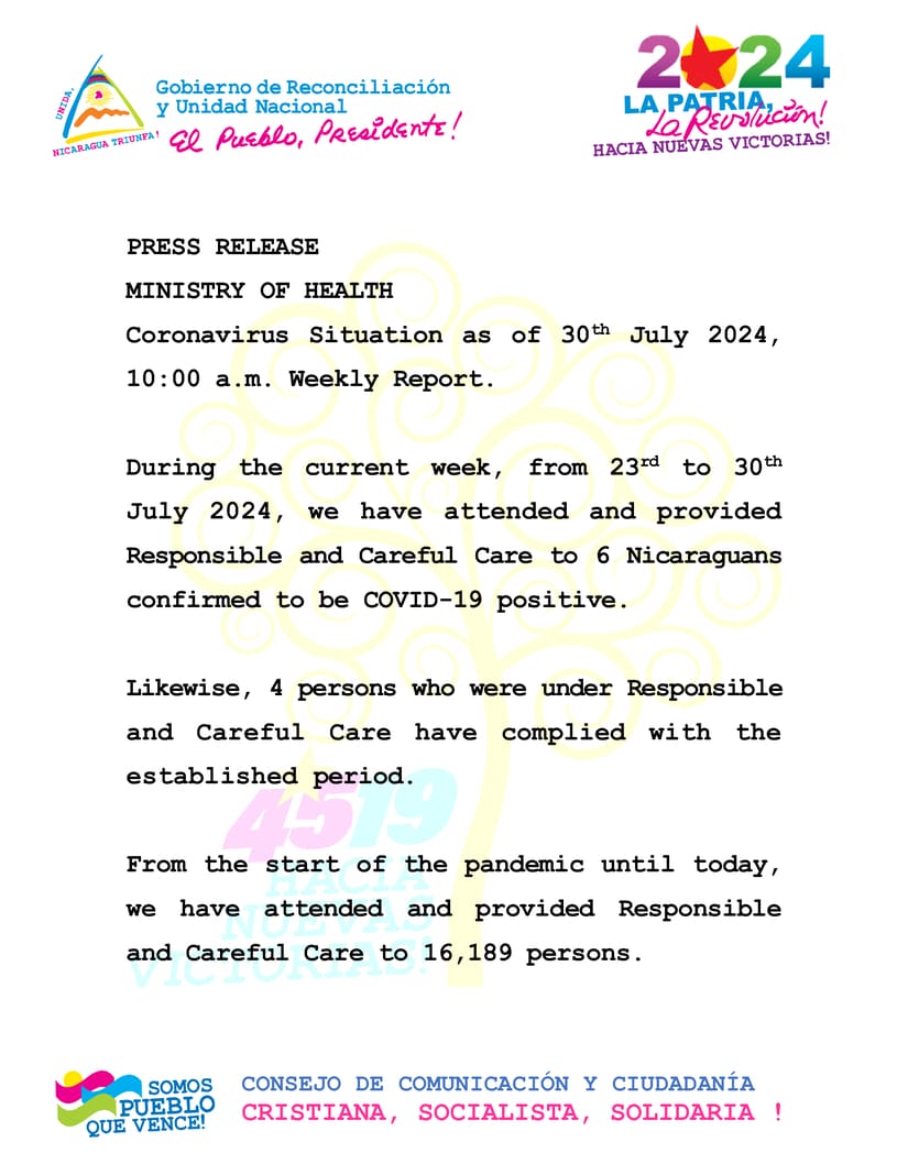 During the current week, from 23rd to 30th July 2024, we have attended and provided Responsible and Careful Care to 6 Nicaraguans confirmed to be COVID-19 positive.