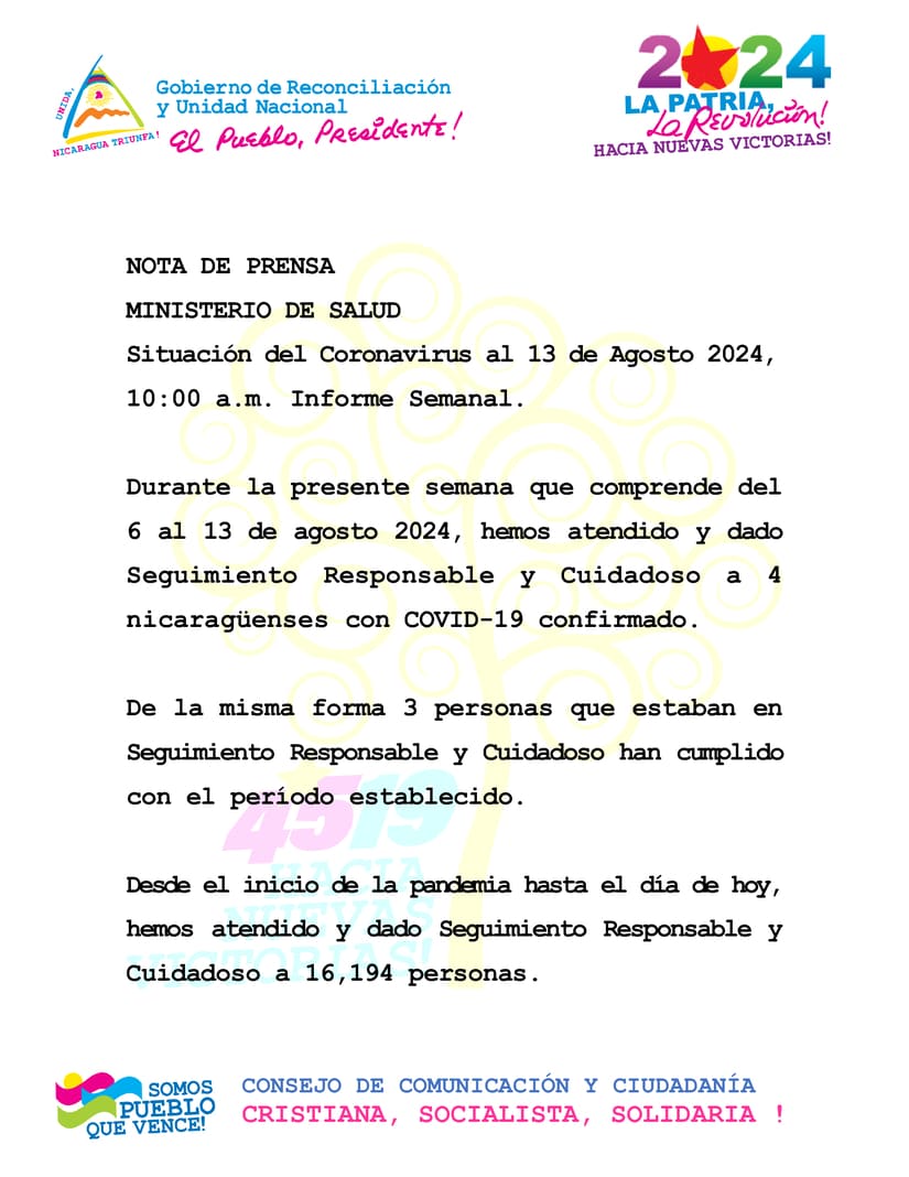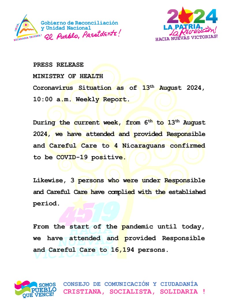 During the current week, from 6th to 13th August 2024, we have attended and provided Responsible and Careful Care to 4 Nicaraguans confirmed to be COVID-19 positive.