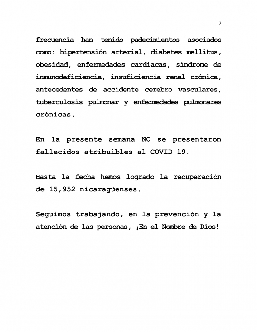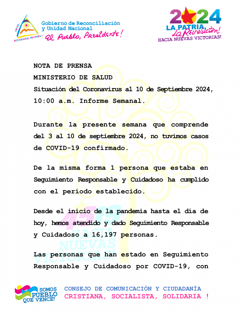 Durante la presente semana que comprende del 3 al 10 de septiembre 2024, no tuvimos casos de COVID-19 confirmado.